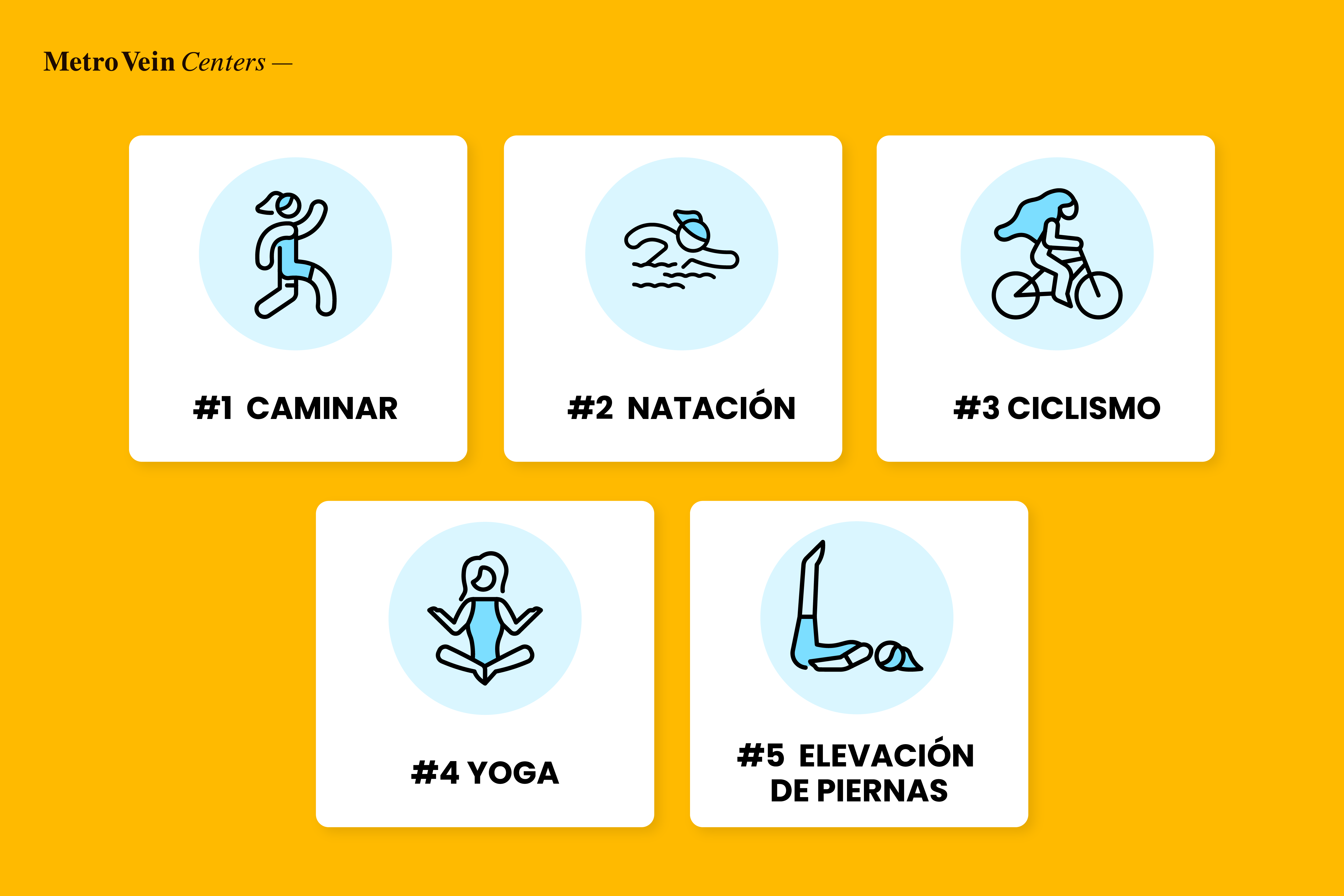 La natación es un ejercicio de bajo impacto que alivia la presión sobre las venas de las piernas y estimula la circulación. Es una alternativa excelente para quienes tienen dificultades con otras actividades cardiovasculares y trabaja simultáneamente varios grupos musculares.